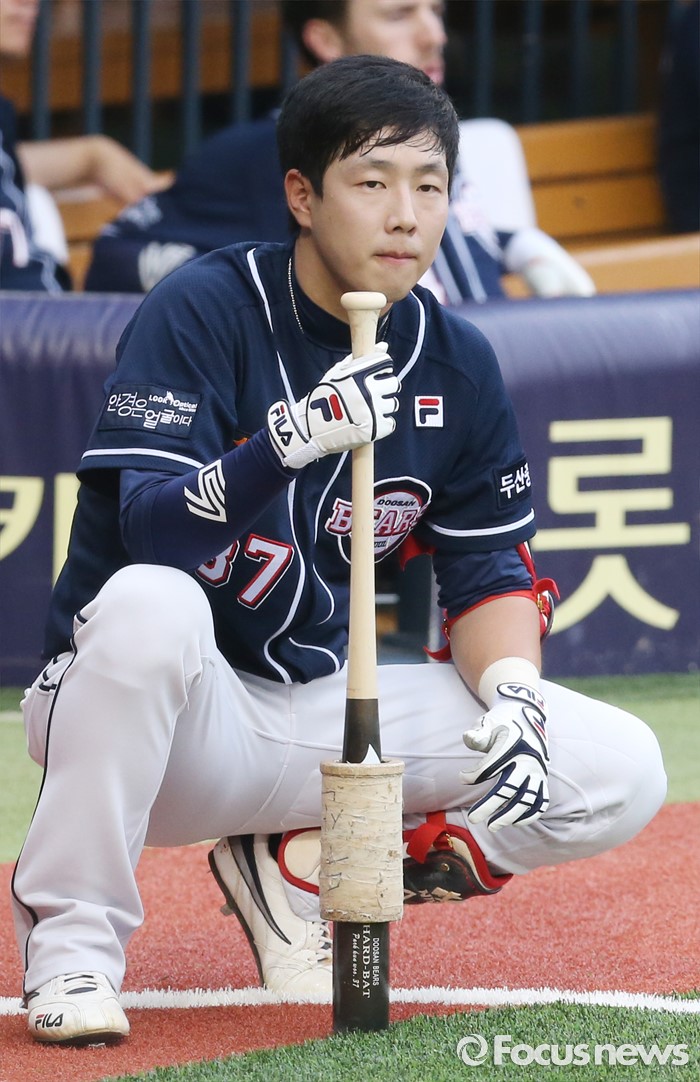 (서울=포커스뉴스) 22일 서울 잠실구장에서 열린 2016 프로야구 두산-LG 경기에서 두산 선두타자 박건우가 대기타석에서 LG 투수 류제국의 투구를 살피고 있다.