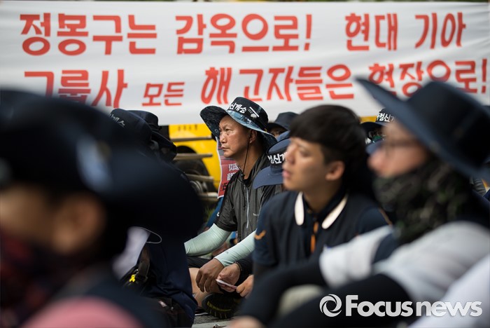 (서울=포커스뉴스) 정부의 일방적인 조선업 구조조정 중단과 현대차 그룹의 성실한 그룹사 공동교섭 참여, 정부의 노동개악 철회등을 내걸며 파업에 들어간 전국금속노조가 22일 오후 서울 서초구 현대자동차 본사 앞에서 금속노조 총파업 대회를 열고 있다.