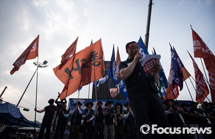 (서울=포커스뉴스) 정부의 일방적인 조선업 구조조정 중단과 현대차 그룹의 성실한 그룹사 공동교섭 참여, 정부의 노동개악 철회등을 내걸며 파업에 들어간 전국금속노조가 22일 오후 서울 서초구 현대자동차 본사 앞에서 금속노조 총파업 대회를 열고 있다.