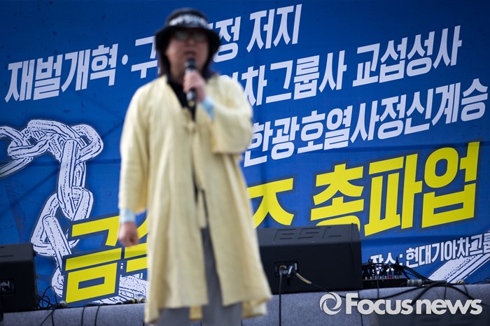 (서울=포커스뉴스) 정부의 일방적인 조선업 구조조정 중단과 현대차 그룹의 성실한 그룹사 공동교섭 참여, 정부의 노동개악 철회등을 내걸며 파업에 들어간 전국금속노조가 22일 오후 서울 서초구 현대자동차 본사 앞에서 금속노조 총파업 대회를 열고 있다.