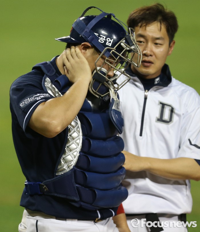 (서울=포커스뉴스) 22일 서울 잠실구장에서 열린 2016 프로야구 두산-LG 경기 6회말 두산 포수 양의지가 LG 박용택의 스윙에 맞은 머리를 쓰다듬고 있다.