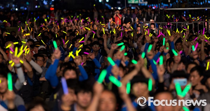 (서울=포커스뉴스) 22일 오후 서울 광화문광장에서 열린 2016 재벌개혁 시민한마당에서 전국금속노동조합(금속노조)이 율동공연을 보며 야광봉을 흔들고 있다.