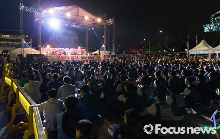 (서울=포커스뉴스) 22일 오후 서울 광화문광장에서 열린 2016 재벌개혁 시민한마당에서 전국금속노동조합(금속노조)이 율동공연을 보며 야광봉을 흔들고 있다.
