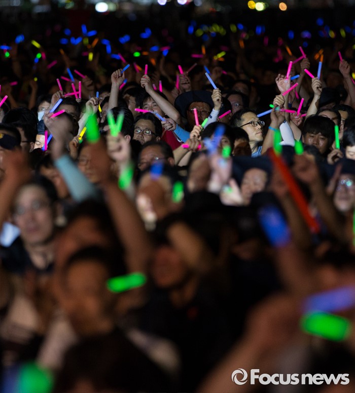 (서울=포커스뉴스) 22일 오후 서울 광화문광장에서 열린 2016 재벌개혁 시민한마당에서 전국금속노동조합(금속노조)이 율동공연을 보며 야광봉을 흔들고 있다.