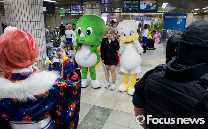 (서울=포커스뉴스) 23일 오전 서울 도봉구 쌍문역에서 코스프레를 한 학생들이 둘리와 기념촬영을 하고 있다, 이날 쌍문동 둘리뮤지엄에서는 개관 1주년을 맞아'둘리네 집들이' 가 열렸다.