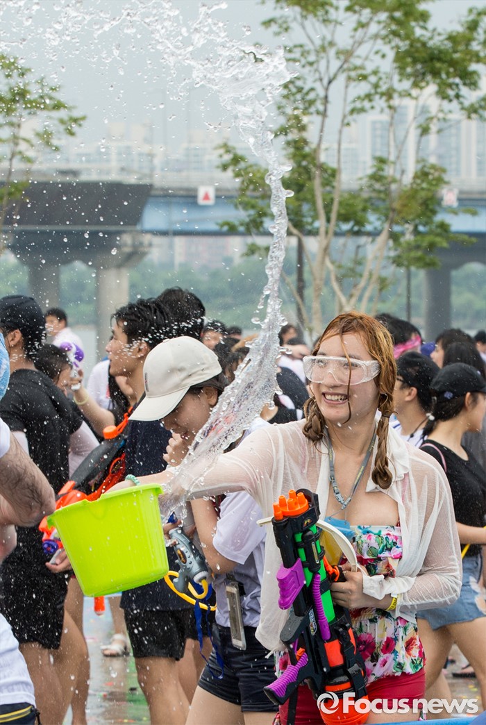 (서울=포커스뉴스) 23일 오후 서울 여의도 한강공원에서 열린 한강 물싸움 축제에서 참가자들이 시원한 물총싸움을 하며 더위를 식히고 있다.