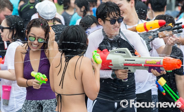 (서울=포커스뉴스) 23일 오후 서울 여의도 한강공원에서 열린 한강 물싸움 축제에서 참가자들이 시원한 물총싸움을 하며 더위를 식히고 있다.