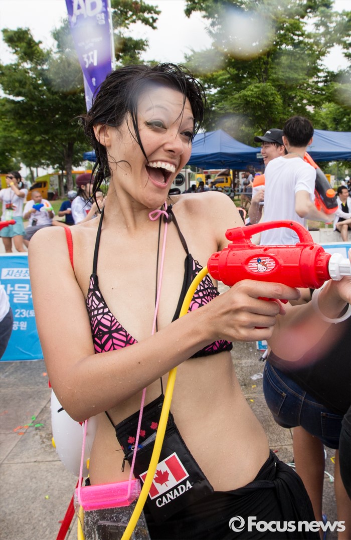 (서울=포커스뉴스) 23일 오후 서울 여의도 한강공원에서 열린 한강 물싸움 축제에서 참가자들이 시원한 물총싸움을 하며 더위를 식히고 있다.
