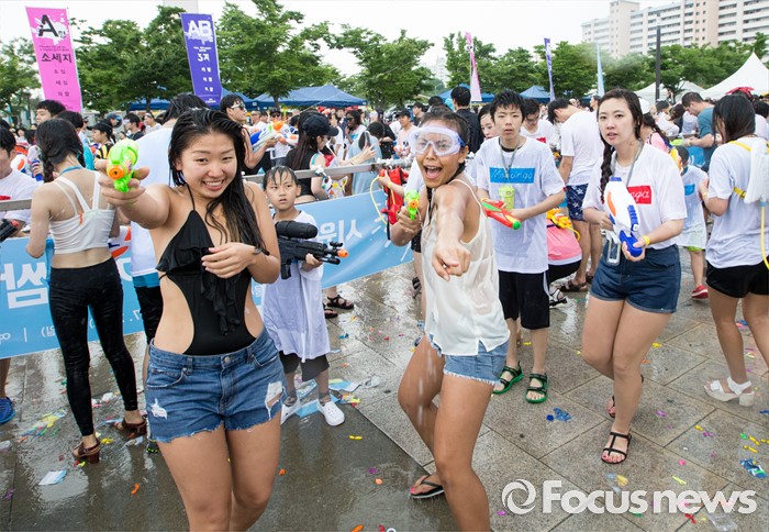 (서울=포커스뉴스) 23일 오후 서울 여의도 한강공원에서 열린 한강 물싸움 축제에서 참가자들이 시원한 물총싸움을 하며 더위를 식히고 있다.