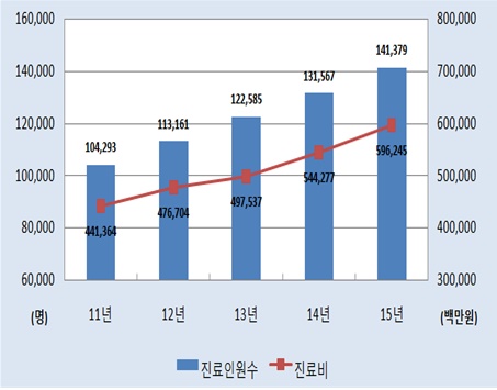 진료비는 4년 간 4414억원(2011년)에서 5962억 원(2015년)으로 1548억원(35.1%) 늘어났다.
