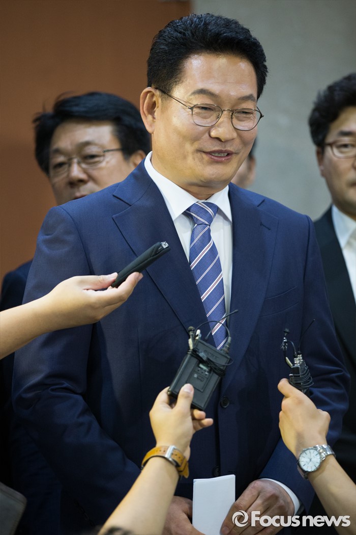 (서울=포커스뉴스) 송영길 더불어민주당 의원이 24일 오전 서울 여의도 국회 정론관에서 당대표 출마 기자회견을 마친 뒤 취재진 질문에 답하고 있다.