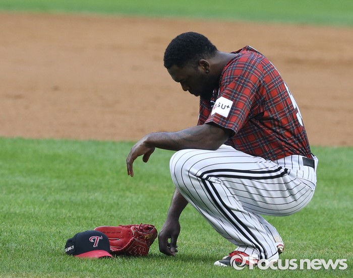 (서울=포커스뉴스) 24일 서울 잠실구장에서 열린 2016 프로야구 두산-LG 경기 3회초 두산 김재환의 도루에 대한 합의판정때 LG 투수 소사가 잔디를 고르며 결과를 기다리고 있다.