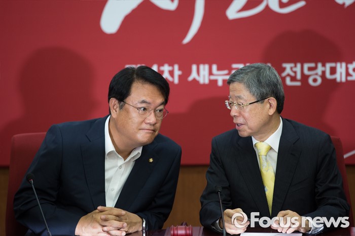 (서울=포커스뉴스) 김희옥(오른쪽) 새누리당 혁신비상대책위원장과 정진석 새누리당 원내대표가 25일 오전 서울 여의도 새누리당사에서 열린 혁신비상대책위원회의에 참석해 대화 하고 있다.