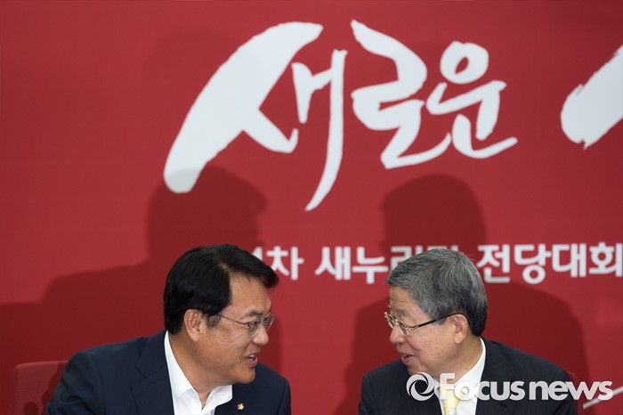 (서울=포커스뉴스) 김희옥(오른쪽) 새누리당 혁신비상대책위원장과 정진석 새누리당 원내대표가 25일 오전 서울 여의도 새누리당사에서 열린 혁신비상대책위원회의에 참석해 대화 하고 있다.