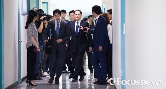 (인천=포커스뉴스) 요하네스 타머(가운데) 아우디폭스바겐 사장이 25일 오전 인천 서구 국립환경과학원에서 열린 차량 인증 조작 관련 환경부 청문회에 참석하고 있다.