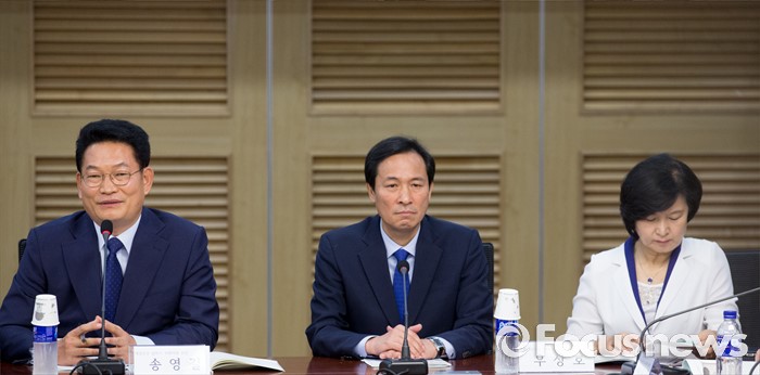 (서울=포커스뉴스) 25일 오전 서울 여의도 국회 의원회관에서 개성공단살리기 국회의원 모임 주최로 열린 개성공단 전면중단, 고도의 정치적 행위 논리 정당한가? 세미나에 전당대회 출마를 선언한 송영길 더불어민주당 의원이 참석해 개회사를 하고 있다. 왼쪽부터 송 의원, 우상호 원내대표, 전당대회 출마 선언한 추미애 의원.