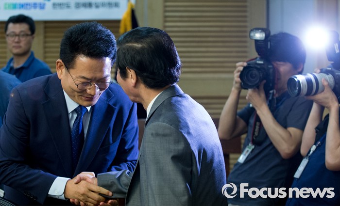(서울=포커스뉴스) 25일 오전 서울 여의도 국회 의원회관에서 개성공단살리기 국회의원 모임 주최로 열린 개성공단 전면중단, 고도의 정치적 행위 논리 정당한가? 세미나에 참석한 정기섭(오른쪽) 개성공단기업 비대위원장과 전당대회 출마를 선언한 송영길 더불어민주당 의원이 인사하고 있다.