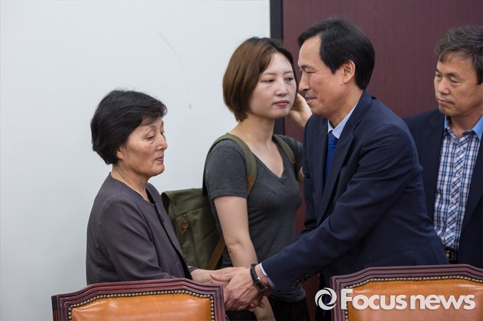 | △ 악수하는 우상호 원내대표-백경숙 씨 |