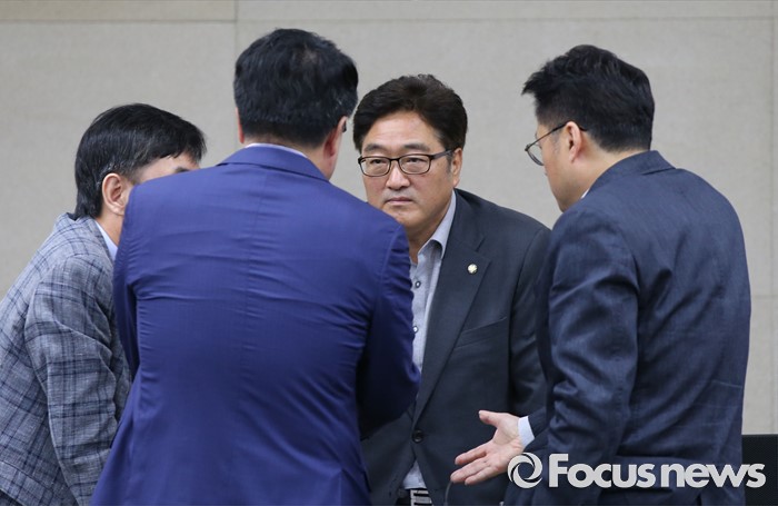 (세종=포커스뉴스) 25일 오전 세종시 정부세종청사 국회회의실에서 열린 환경부·고용노동부·국립환경과학원·안전보건공단에 대한 국회 가습기살균제 특조위 현장조사에서 우원식 위원장이 간사들과 논의를 하고 있다.