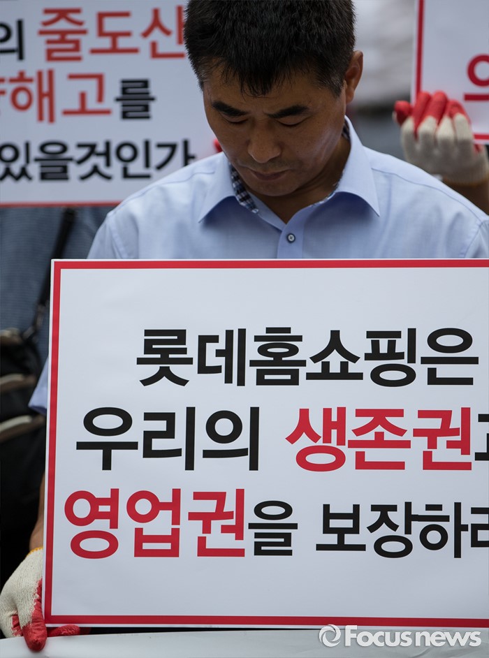 (서울=포커스뉴스) 25일 오전 서울 중구 롯데백화점 앞에서 롯데홈쇼핑 협력사 비상대책위원회원들이 생존권 보장을 촉구하며 집회를 열고 있다.