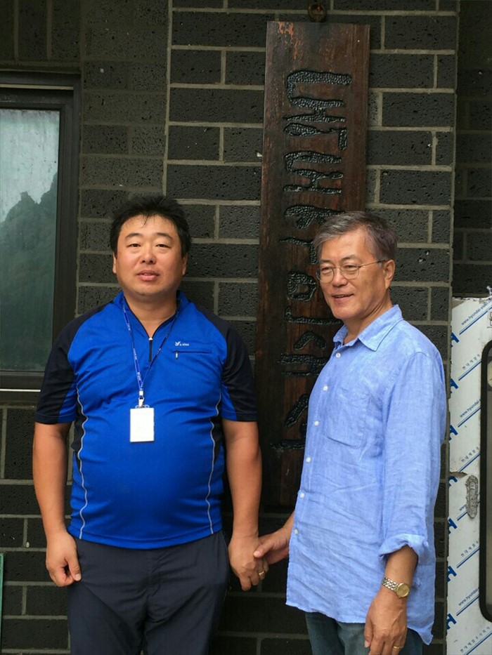 (서울=포커스뉴스) 문재인 더불어민주당 전 대표가 광복절을 앞두고 25일 독도를 방문, 독도사무소와 독도 주민숙소를 겸하고 있는 시설 앞에서 울릉군청 소속 직원을 격려하고 있다. <사진제공=문재인 전 대표측>