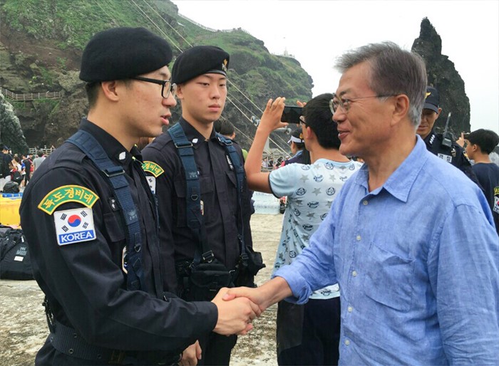 (서울=포커스뉴스) 문재인 더불어민주당 전 대표가 광복절을 앞두고 25일 독도를 방문, 경비대원들을 격려하고 있다. <사진제공=문재인 전 대표측>