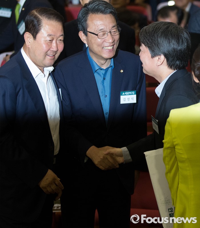 (서울=포커스뉴스) 25일 오후 서울 여의도 국회 의원회관에서 열린 국민의당 지역위원장 임명장 수여식 및 연석회의에 참석한 안철수(오른쪽부터) 전 상임공동대표, 김성식 정책위의장, 박주선 국회 부의장이 인사하고 있다.
