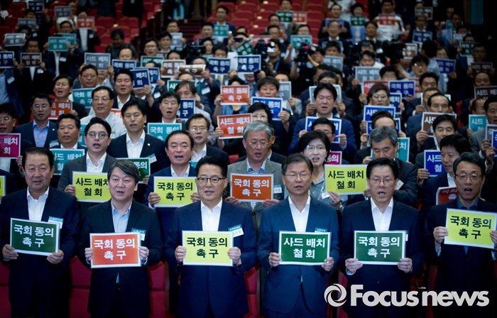 (서울=포커스뉴스) 25일 오후 서울 여의도 국회 의원회관에서 열린 국민의당 지역위원장 임명장 수여식 및 연석회의에 참석한 박주선(앞줄 왼쪽부터) 국회 부의장, 안철수 전 상임공동대표, 박지원 비상대책위원장, 천정배 전 공동대표, 주승용 비대위원, 김성식 정책위의장 등이 사드배치 철회 등을 촉구하는 피켓 퍼포먼스를 하고 있다.
