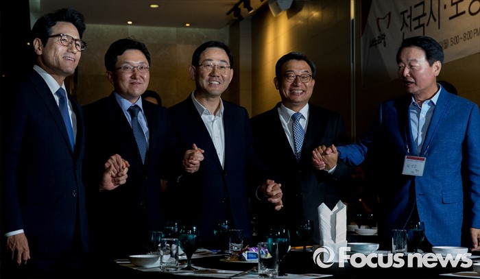 (서울=포커스뉴스) 전당대회 대표최고위원 출마를 선언한 정병국(왼쪽부터), 김용태, 주호영, 이정현, 한선교 새누리당 의원이 25일 오후 서울 여의도 중소기업중앙회관에서 열린 중앙위원회 전국시도당연합회 월례회 행사에 참석해 취재진을 향해 포즈를 취하고 있다.