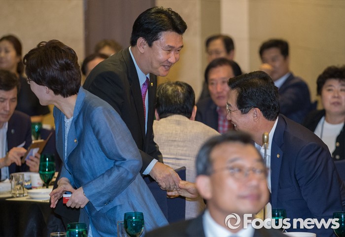(서울=포커스뉴스) 전당대회 최고위원 출마를 선언한 정용기(가운데), 이장우(오른쪽) 새누리당 의원이 25일 오후 서울 여의도 중소기업중앙회관에서 열린 중앙위원회 전국시도당연합회 월례회 행사에 참석해 인사하고 있다.