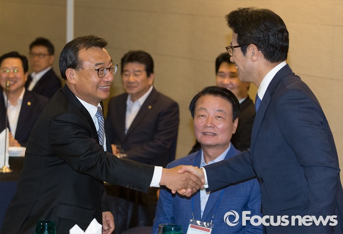 (서울=포커스뉴스) 전당대회 대표최고위원 출마를 선언한 정병국(오른쪽부터), 한선교, 이정현 새누리당 의원이 25일 오후 서울 여의도 중소기업중앙회관에서 열린 중앙위원회 전국시도당연합회 월례회 행사에 참석해 인사하고 있다.