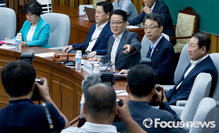 (서울=포커스뉴스) 26일 오전 서울 여의도 국회에서 열린 국민의당 의원총회에 참석한 박지원 비상대책위원장이 의원들과 대화하고 있다.
