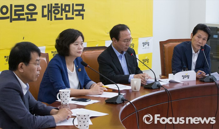 (서울=포커스뉴스) 26일 오전 서울 여의도 국회에서 열린 정의당 의원총회에 참석한 윤소하 의원이 발언하고 있다. 왼쪽부터 김종대 의원, 이정미 원내수석부대표, 노회찬 원내대표, 윤 의원.
