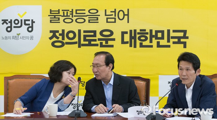 (서울=포커스뉴스) 26일 오전 서울 여의도 국회에서 열린 정의당 의원총회에 참석한 노회찬(가운데) 원내대표와 이정미(왼쪽) 원내수석부대표가 대화하고 있다. 오른쪽은 윤소하 의원.