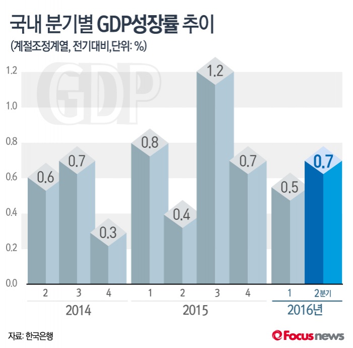 (서울=포커스뉴스) 26일 한국은행이 발표한 ‘2016년 2분기 실질 국내총생산(속보)'에 따르면 올 2분기 GDP는 전기 대비 0.7% 증가했다. 실질 GDP성장률은 지난해 4분기 이후 3분기 연속 0%대를 기록하고 있다.