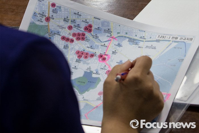 (서울=포커스뉴스) 26일 오전 정부서울청사에서 열린 가스 및 악취 발생 관계기관 안전점검회의에 참석한 한 관계자가 가스냄새 민원 신고지점들이 표시된 지도를 살펴보고 있다.