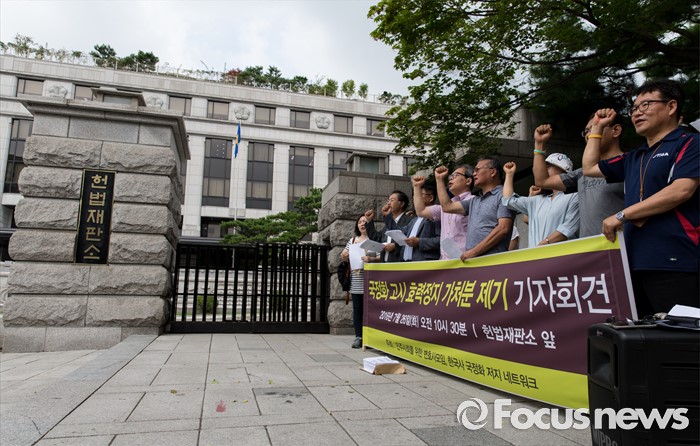 (서울=포커스뉴스) 26일 오전 서울 종로구 헌번법재판소 앞에서 민주사회를 위한 변호사모임과 한국사국정화저지네트워크가 국정화 고시 효력정지 가처분 제기 기자회견을 하고 있다.