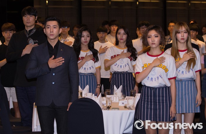 (서울=포커스뉴스) 26일 오전 서울 종로구 세종문화회관에서 열린 '2016 전국기능경기대회 서울특별시 선수단 결단식 및 홍보대사 위촉식'에 참석한 요리사 최현석(왼쪽부터)와 가수 브라이언, 걸그룹 마마무의 버 휘인, 솔라, 화사, 문별이 국민의례를 하고 있다.
