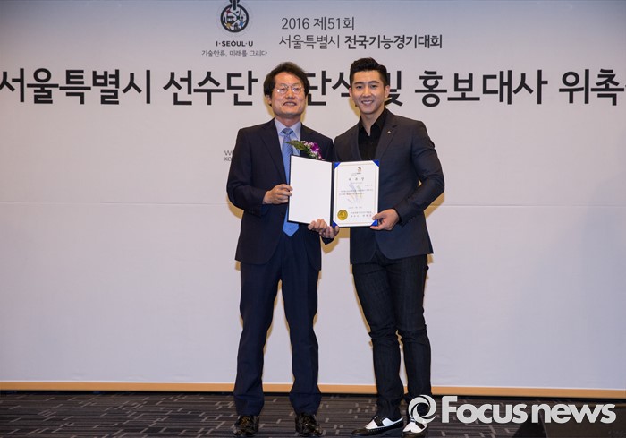 (서울=포커스뉴스) 26일 오전 서울 종로구 세종문화회관에서 열린 '2016 전국기능경기대회 서울특별시 선수단 결단식 및 홍보대사 위촉식'에 참석한 조희연(왼쪽) 서울시 교육감이 가수 브라이언과 기념촬영을 하고 있다.
