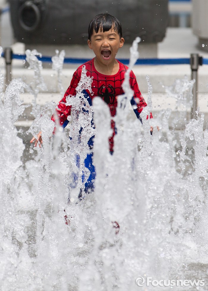 (서울=포커스뉴스) 무더위가 지속되고 있는 26일 오전 광화문광장 분수대에서 한 아이가 물놀이를 즐기고 있다.