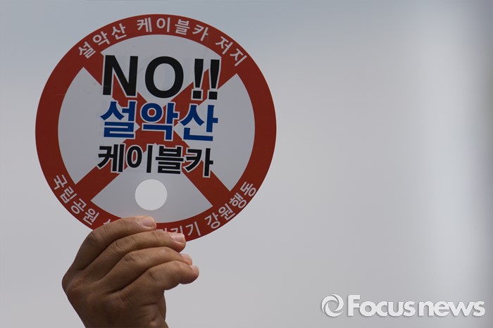 (서울=포커스뉴스) 26일 오전 서울 광화문광장에서 열린 설악산 케이블카 반대 기자회견에 참석한 설악산국립공원지키기 국민행동 회원들이 케이블카 취소 촉구 피켓을 들고 있다.