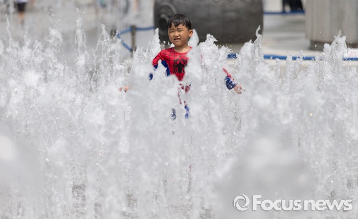 (서울=포커스뉴스) 무더위가 지속되고 있는 26일 오전 광화문광장 분수대에서 한 아이가 물놀이를 즐기고 있다.