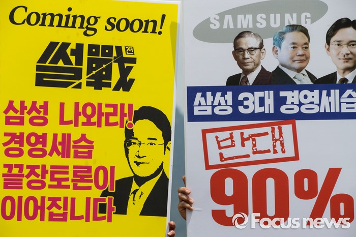 (서울=포커스뉴스) 26일 오전 서울 종로구 광화문광장에서 열린 삼성 경영권 세습 공개토론 제안 기자회견에 참석자들이 삼성의 경영세습을 비판하는 내용이 적힌 손 피켓을 들고 있다.