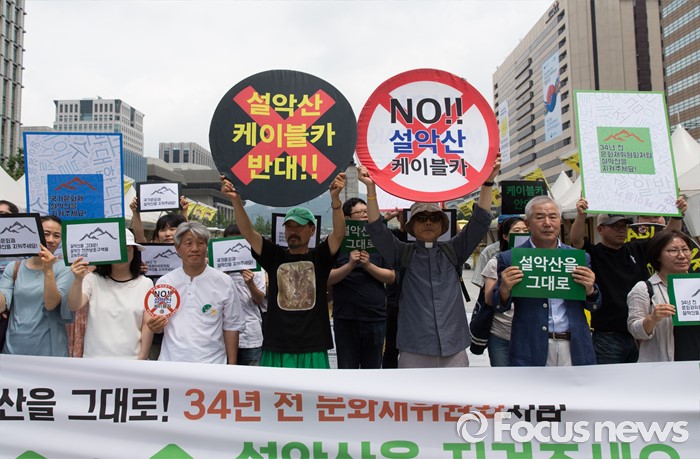 (서울=포커스뉴스) 26일 오전 서울 광화문광장에서 열린 설악산 케이블카 반대 기자회견에 참석한 설악산국립공원지키기 국민행동 회원들이 케이블카 취소 촉구 피켓을 들고 있다.