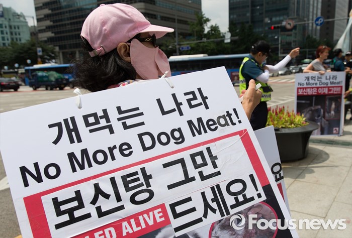 (서울=포커스뉴스) 26일 오전 서울 종로구 광화문광장에서 세이브 코리언 독스 회원이 개고기 문화를 반대하는 피켓을 들고 있다.