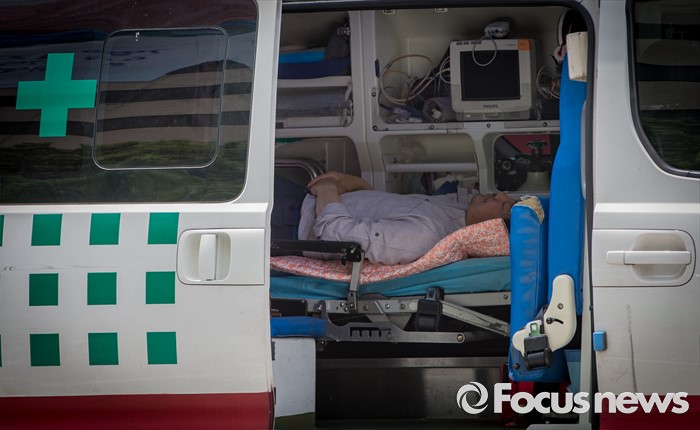 (서울=포커스뉴스) 석탄화력발전소 증설 중단을 요구하며 단식농성을 일주일 째 이어오던 김홍장 당진시장이 26일 오후 서울 종로구 광화문광장에서 건강 이상으로 들것에 실려 구급차로 향하고 있다.