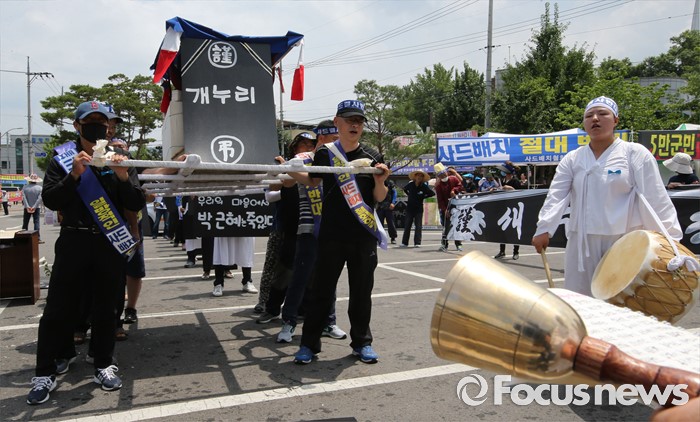 (성주=포커스뉴스) 26일 오전 경북 성주군청을 찾은 정신석 새누리당 원내대표와 지도부들이 성주군민들과 간담회를 가진 가운데 성주주민들이 상여를 매고 사드배치 반대를 촉구하고 있다.