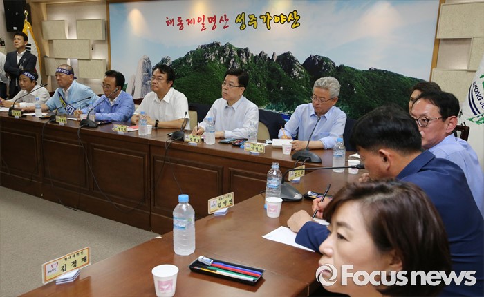 (성주=포커스뉴스) 26일 오전 경북 성주군청을 찾은 정신석 새누리당 원내대표와 지도부들이 성주군민들과 간담회를 갖고 있다.