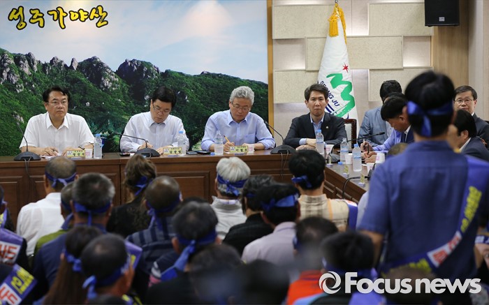 (성주=포커스뉴스) 26일 오전 경북 성주군청을 찾은 정신석 새누리당 원내대표와 지도부들이 성주군민들과 간담회를 갖고 있다.