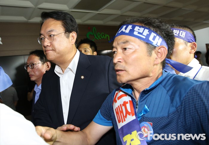 (성주=포커스뉴스) 26일 오전 경북 성주군청을 찾은 정신석 새누리당 원내대표와 지도부들이 성주군민들과 간담회를 마치고 군청을 나오던 중에 주민에게 항의를 받고 있다.
